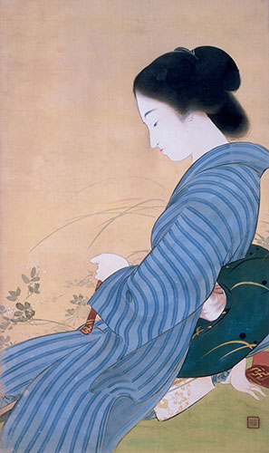 秋草あきくさ 作品を拡大する 明治35年(1902) 絹本着色・軸 60.1 × 35.9 cm 仲間と日本画研究会「烏合会」を結成した翌年に描かれた、初期の美人画作品です。季節の情趣ただよう女性の姿に、清方らしい美人画の萌芽を見ることができます。 背景には萩とススキが描かれ、単衣の着物を着ている女性の白い腕が布越しに薄く透けて見えています。背景の植物と人物の装いで夏から秋へと移る季節を表しました。 種類 本画 Japanese Painting 下絵 Preparatory Drawing スケッチ Sketch 挿絵 Illustration 資料 Others 制作年代 制作年不詳 明治以前 明治 大正 昭和(戦前~戦中) 昭和(戦後) 作者 あ行 榎本千花俊 伊東深水 アンリ・オットマン Henry Ottmann か行 鏑木照 鏑木清方 な行 西田青坡 初代中村吉右衛門 ま行 水野秀方 水野年方 や行 山川秀峰