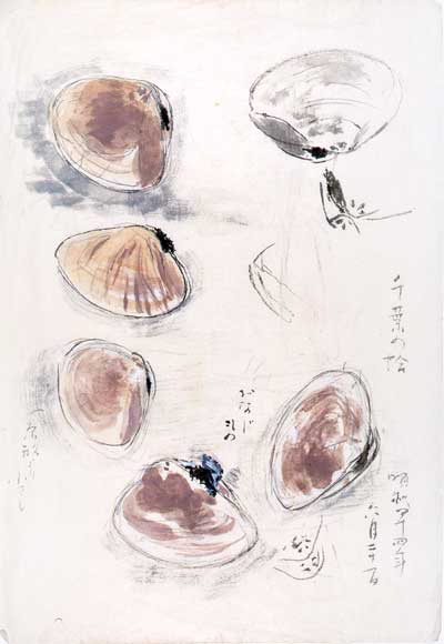 今様絵詞の会「千葉の蛤」いまようえことばのかい ちばのはまぐり 作品を拡大する 昭和44年(1969) 紙本墨画淡彩・裏打ち 40.1×28.1 ㎝ 今様絵詞の会は清方91歳となる昭和44年(1969)に日本橋髙島屋で開催された個展です。 明治から昭和まで長く生きた清方の心に残る人や風景を絵と詞により表現し、《行徳の常夜燈》《築地川みちしほ》《金の井の李月夜》《下町に灯のともる頃》《節句雛菓子》《大橋際のむきみや》《麗人影像》《金沢あさり》《露芝》《豆捻を噛む童》を出品しました。本資料はその下絵です。 種類 本画 Japanese Painting 下絵 Preparatory Drawing スケッチ Sketch 挿絵 Illustration 資料 Others 制作年代 制作年不詳 明治以前 明治 大正 昭和(戦前~戦中) 昭和(戦後) 作者 あ行 榎本千花俊 伊東深水 アンリ・オットマン Henry Ottmann か行 鏑木照 鏑木清方 な行 西田青坡 初代中村吉右衛門 ま行 水野秀方 水野年方 や行 山川秀峰