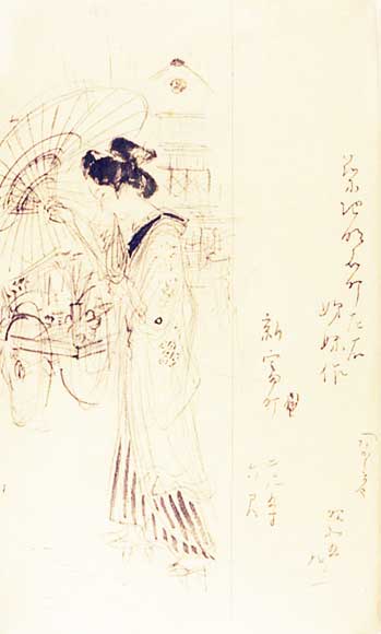 『小下画昭和5年6月作』こじたえしょうわごねんろくがつさく 作品を拡大する 昭和5年(1930) 画帖・和綴 24.9×17.0×0.8 ㎝ 《築地明石町》の関連作である《新富町》《浜町河岸》(昭和5年・1930)のほか、昭和後期に制作した作品の小下絵を一冊にまとめたものです。本資料から、各作品の制作の出発点をうかがうことができます。 種類 本画 Japanese Painting 下絵 Preparatory Drawing スケッチ Sketch 挿絵 Illustration 資料 Others 制作年代 制作年不詳 明治以前 明治 大正 昭和(戦前~戦中) 昭和(戦後) 作者 あ行 榎本千花俊 伊東深水 アンリ・オットマン Henry Ottmann か行 鏑木照 鏑木清方 な行 西田青坡 初代中村吉右衛門 ま行 水野秀方 水野年方 や行 山川秀峰