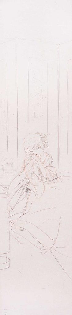 日本橋三越で開催された鏑木清方個展「芝居絵」に出品された三幅対《入谷の寮(雪夕入谷畦道)》の下絵。芝居を題材にした個展の開催にあたり、清方は脚本を自身で演出することを想像しながら手がけたといいます。また三人の主な役どころで三幅対を作ることにも興味を寄せ、《本朝廿四孝》や《おかる三態》など本作以外にも制作しました。
