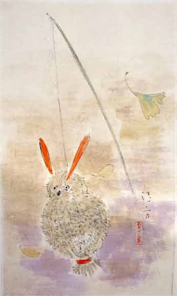 This painting depicts a susuki-mimizuku or owl-shaped doll made of silver-grass fronds. This type of doll dates back to the Edo period, when it was sold as a souvenir to visitors to Kishimojin shrine. Kiyokata remarks that “as well as being elegant and lovable, the doll expresses the habits of this bird well” (ibid).